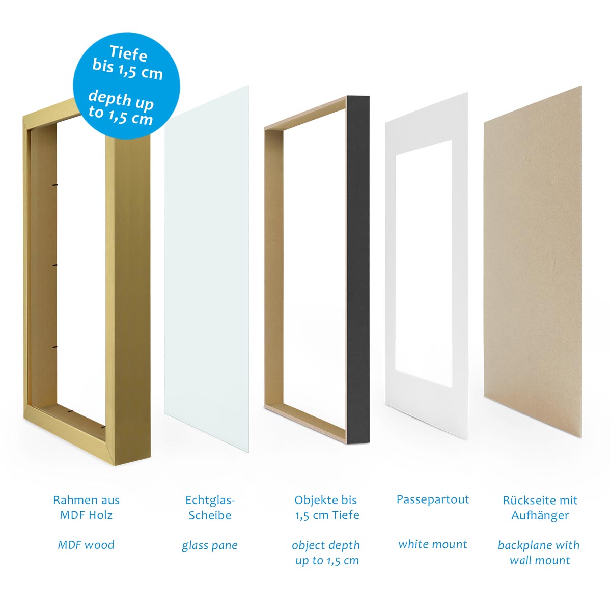 Die Objekt-Rahmen verfügen über einen herausnehmbaren Innenrahmen, der für den Abstand zwischen dem Motiv und der Glasscheibe sorgt. Der Innenrahmen sorgt für viel Flexibilität beim Gestalten. Motiv und Passepartout lassen sich so zum Beispiel direkt hinter der Glasscheibe, direkt vor der Rückwand oder auch mit Abstand zueinander positionieren.